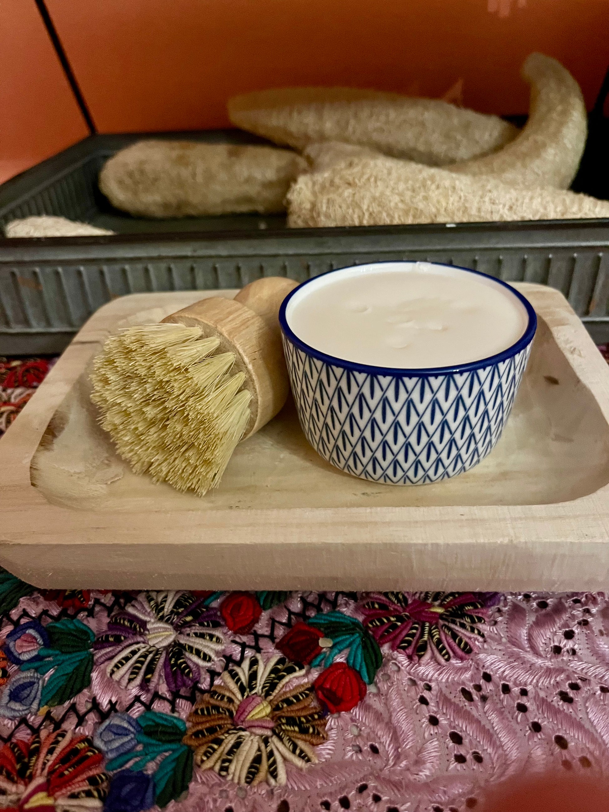 Small but might! This beautiful jar pack a mighty punch with our beloved dish soap. Partner that with lemongrass essential oils and you have a soap that is not to be reckoned with. This jar holds 4oz of soap and comes with the brush you see pictured.