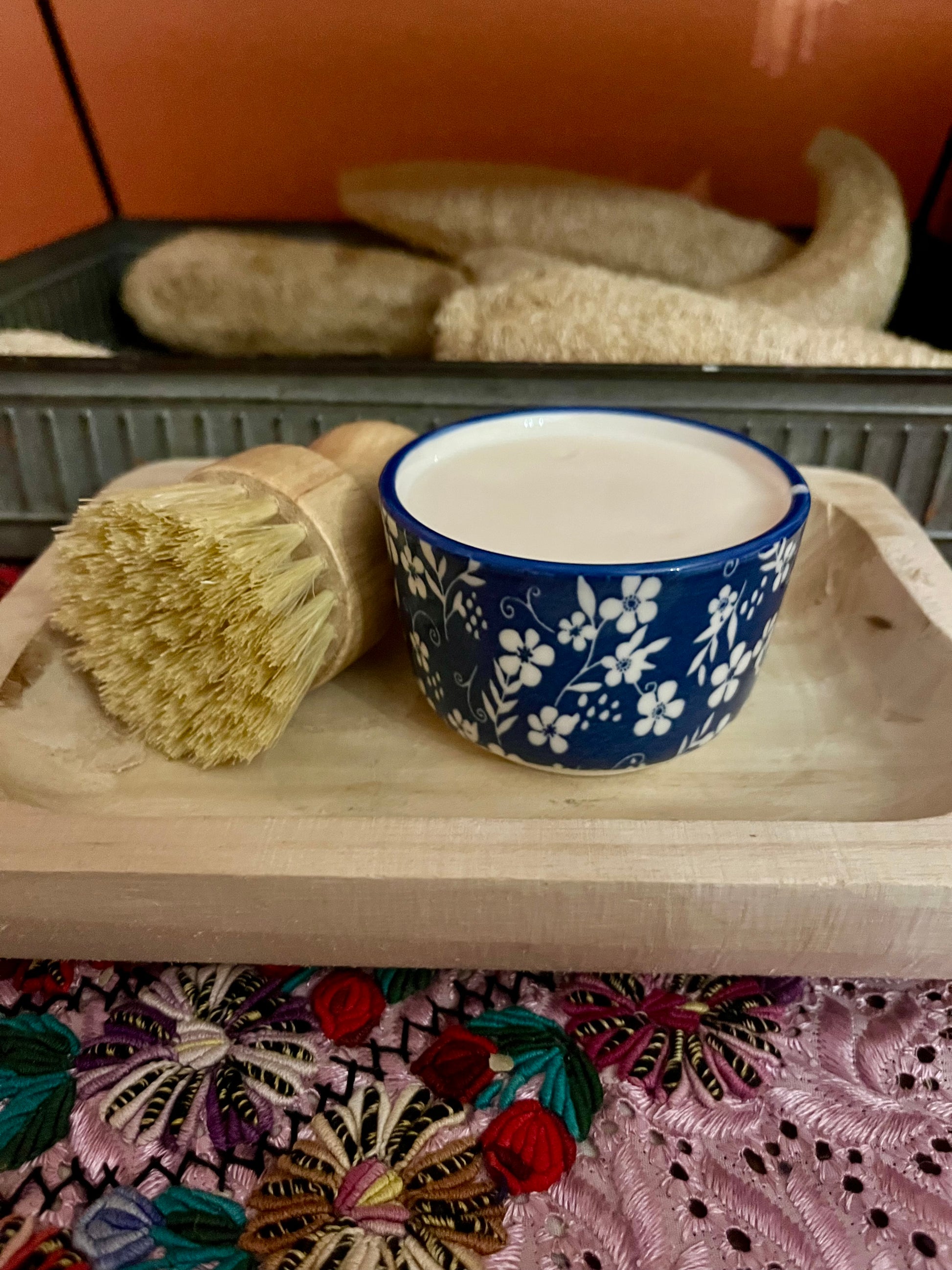 Small but might! This beautiful jar pack a mighty punch with our beloved dish soap. Partner that with lemongrass essential oils and you have a soap that is not to be reckoned with. This jar holds 4oz of soap and comes with the brush you see pictured.
